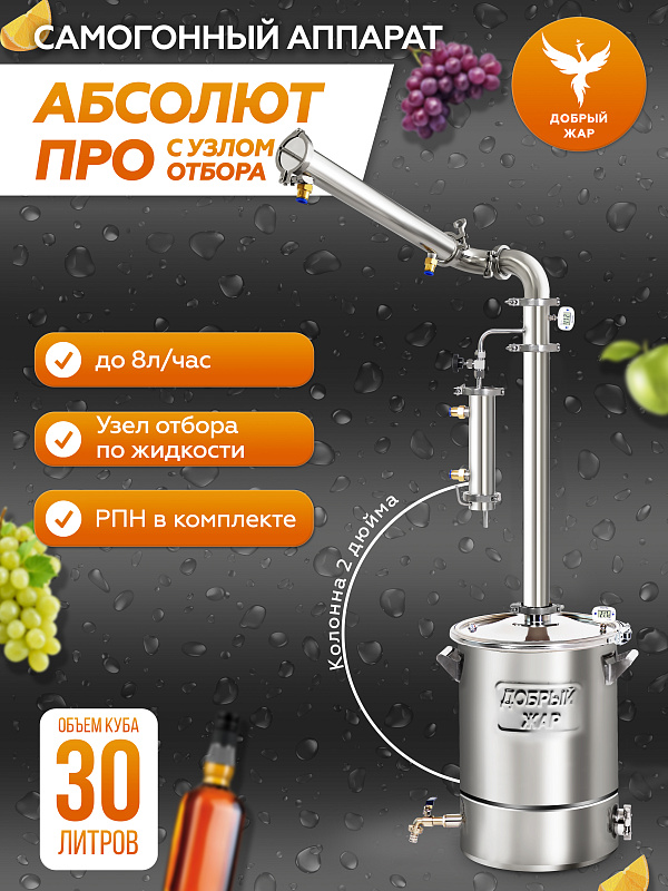 «Абсолют ПРО» - это бражная колонна 2 дюйма, оборудованная узлом отбора по жидкости для стабильного и равномерного отбора дистиллята при второй перегонке, а если говорить проще, то для более качественной очистки.