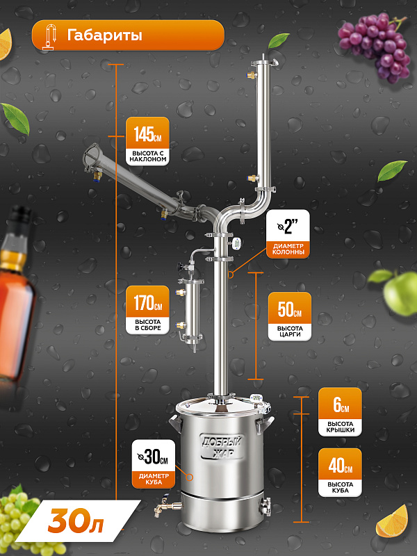 Аппарат комфортно использовать практически в любом помещении (высота аппарата достигает 1,6 м, но регулируется простым наклоном холодильника). Нагревать брагу можно на любой плите или с помощью ТЭНа.